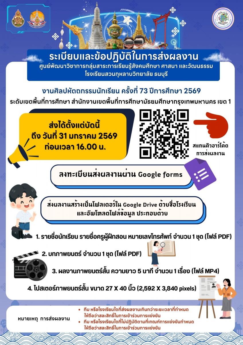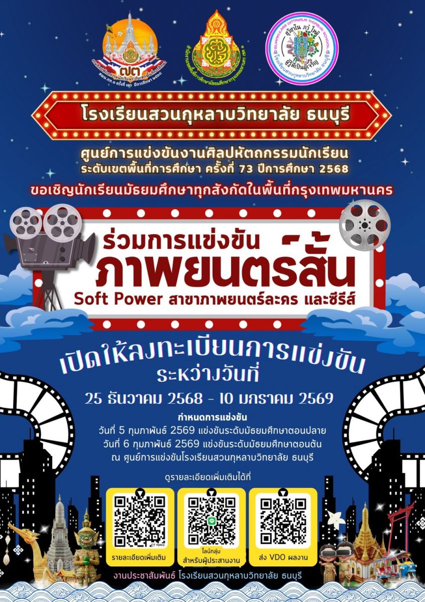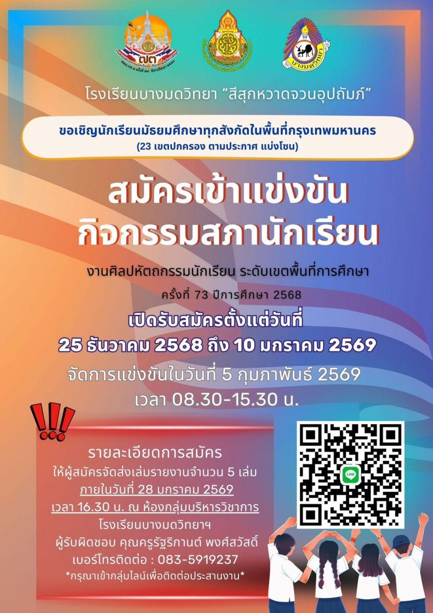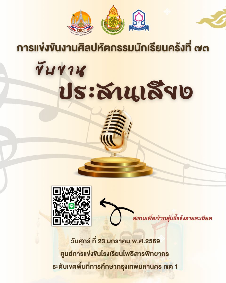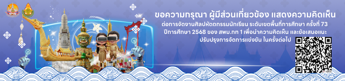 ขอความกรุณา ผู้มีส่วนเกี่ยวข้อง แสดงความคิดเห็นต่อการจัดงานศิลปหัตถกรรมนักเรียน ระดับเขตพื้นที่การศึกษา ครั้งที่ 73 ปีการศึกษา 2568 ของ สพม.กท 1 เพื่อนำความคิดเห็น และข้อเสนอแนะ ปรับปรุงการจัดการแข่งขัน ในครั้งต่อไป