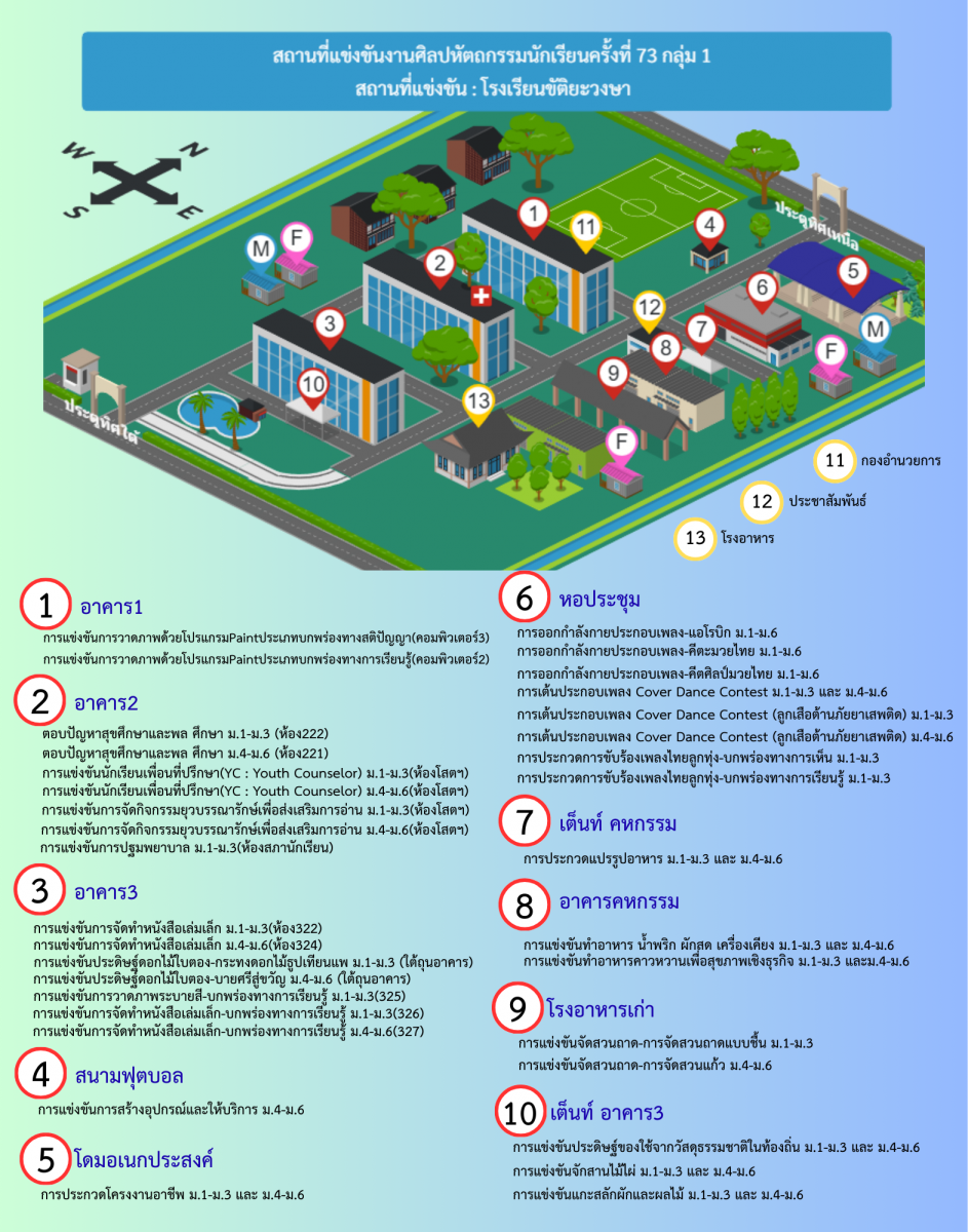 1.การแข่งขันประดิษฐ์ของใช้จากวัสดุธรรมชาติในท้องถิ่น ม.1-3 เวลา 08.00-12.00 น.