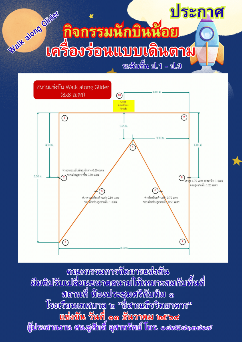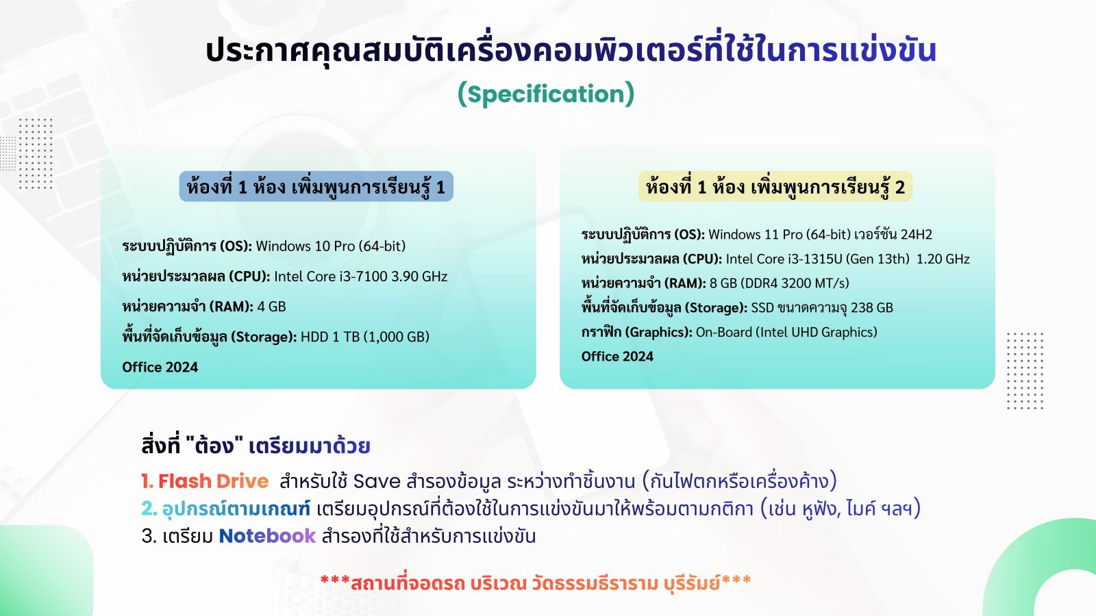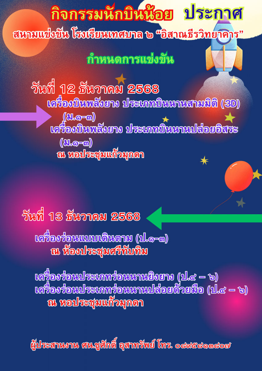 แจ้งให้ผู้เข้าแข่งขันประดิษฐ์ของใช้จากวัสดุธรรมชาติในท้องถิ่นทั้งมัธยมและประถม ขอความกรุณาให้ท่านมาก่อน 8.00 น. จะเริ่มทำการแข่งขันตั้งแต่เวลา 8.00 น. ถึง 12.00 น.