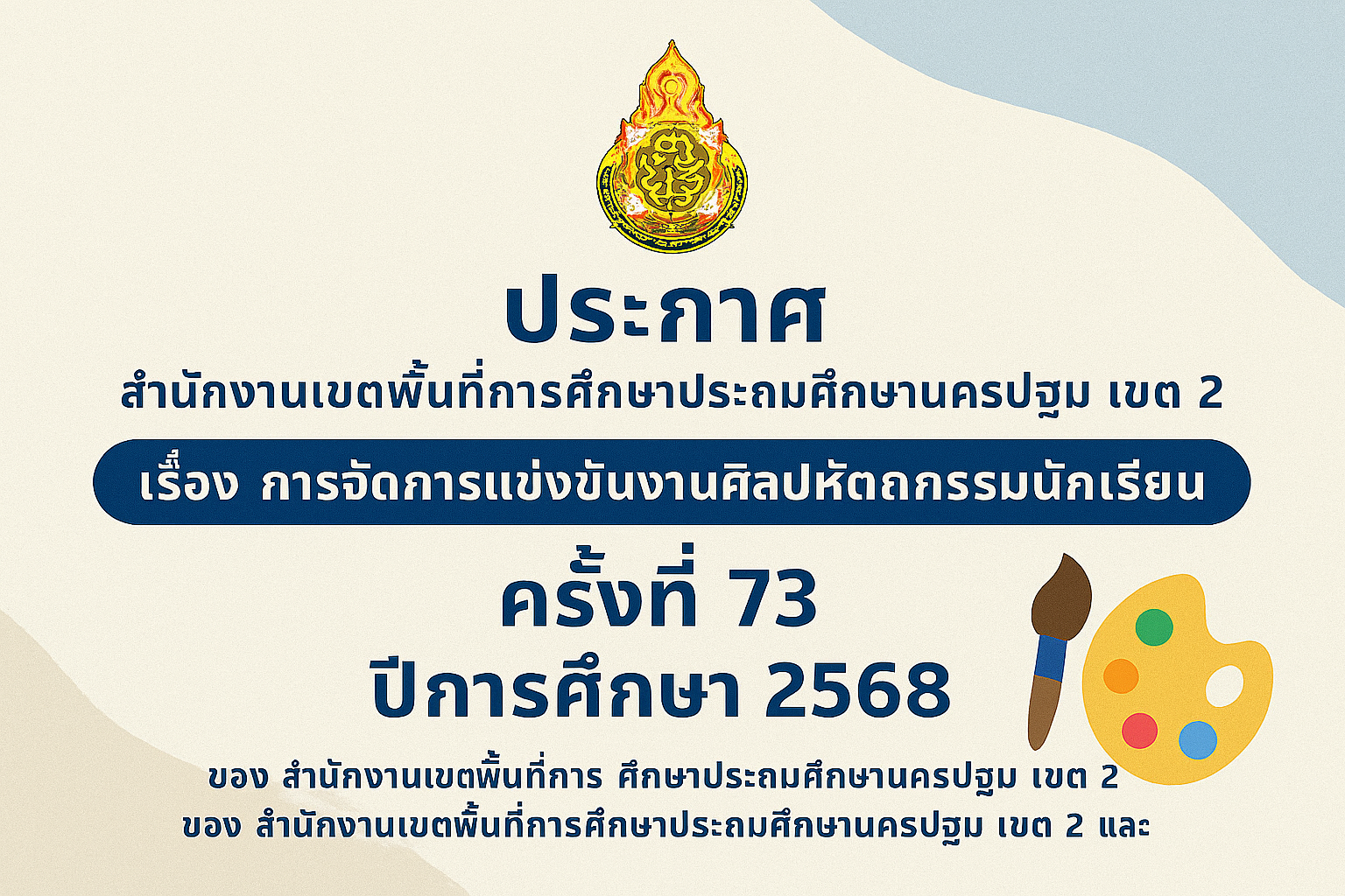 ประกาศสำนักงานเขตพื้นที่การศึกษาประถมศึกษานครปฐม เขต 2 เรื่อง การจัดการแข่งขันงานศิลปหัตถกรรมนักเรียน ครั้งที่ 73 ปีการศึกษา 2568 ของ สำนักงานเขตพื้นที่การศึกษาประถมศึกษานครปฐม เขต 2