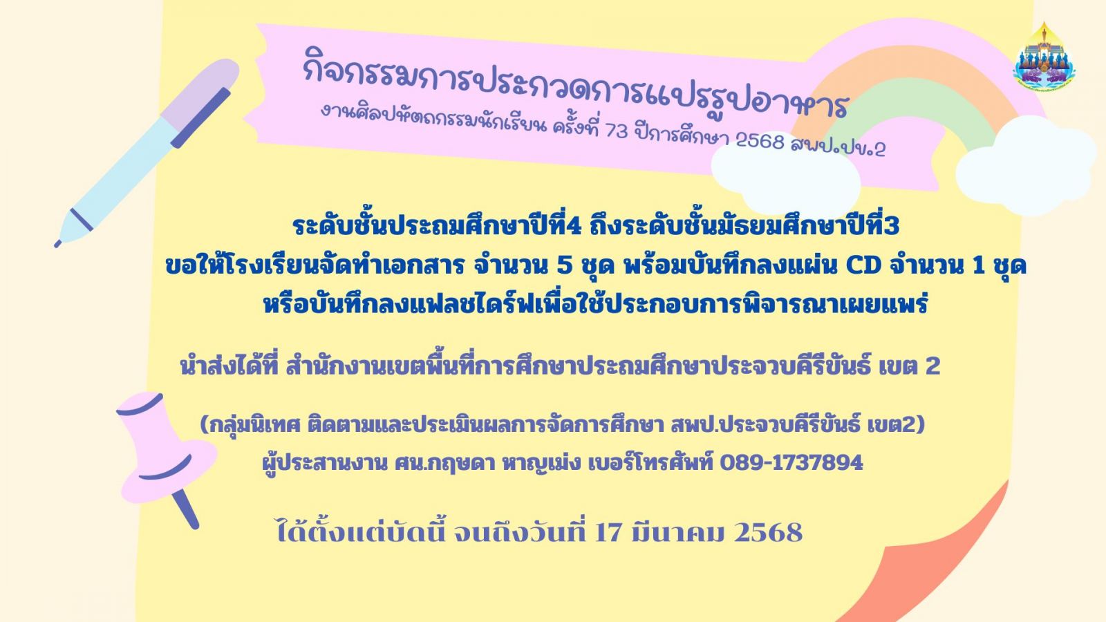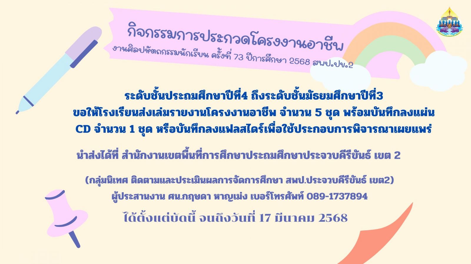 งานศิลปหัตถกรรมนักเรียนระดับเขตพื้นที่การศึกษา ครั้งที่ 73 ปีการศึกษา 2568 (สพป.ประจวบคีรีขันธ์ เขต 2)