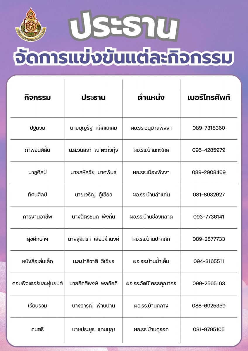 นายสหัสชัย นาคพันธ์ ผู้อำนวยการโรงเรียนเมืองพังงา โทร 089-290-8469