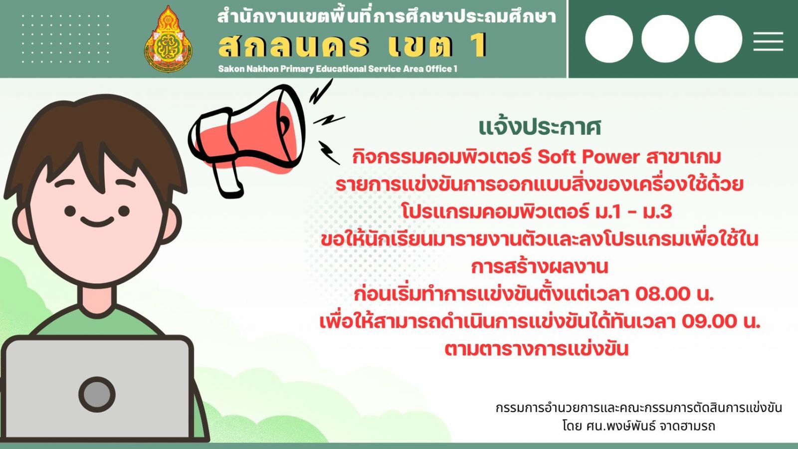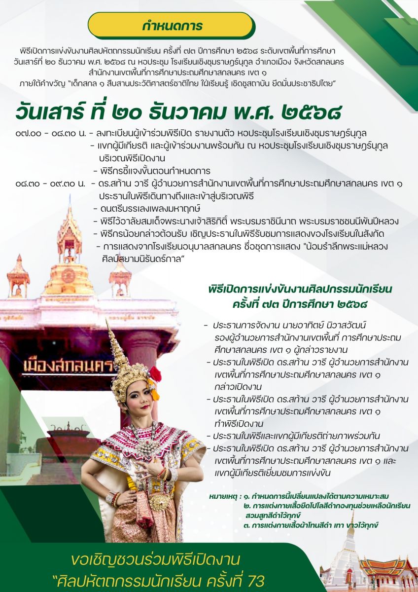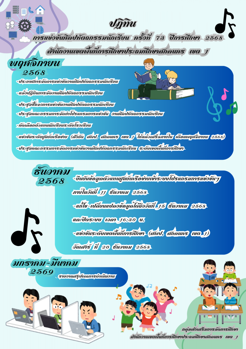 ประกาศ การจัดการแข่งขันศิลปหัตถกรรมนักเรียน ครั้งที่ 73 ประจำปีการศึกษา 2568 ( ประกาศ ณ วันที่ 5 พฤศจิกายน 2568) ประกาศ รายการแข่งขันและเกณฑ์การตัดสิน การแข่งขันศิลปหัตถกรรมนักเรียนครั้งที่ 73 ประจำปีการศึกษา 2568 ( ประกาศ ณ วันที่ 14 พฤศจิกายน 2568) ประกาศ การเปลี่ยนแปลงหัวข้อการแข่งขัน การแข่งขันศิลปหัตถกรรมนักเรียน ครั้งที่ 73 ประจำปีการศึกษา 2568 ( ประกาศ ณ วันที่ 21 พฤศจิกายน 2568) ประกาศ แจ้งแนวทางการแข่งขันศิลปหัตถกรรมนักเรียน ครั้งที่ 73 ประจำปีการศึกษา 2568 ระดับเขตพื้นที่การศึกษา ( ประกาศ ณ วันที่ 3 ธันวาคม 2568)